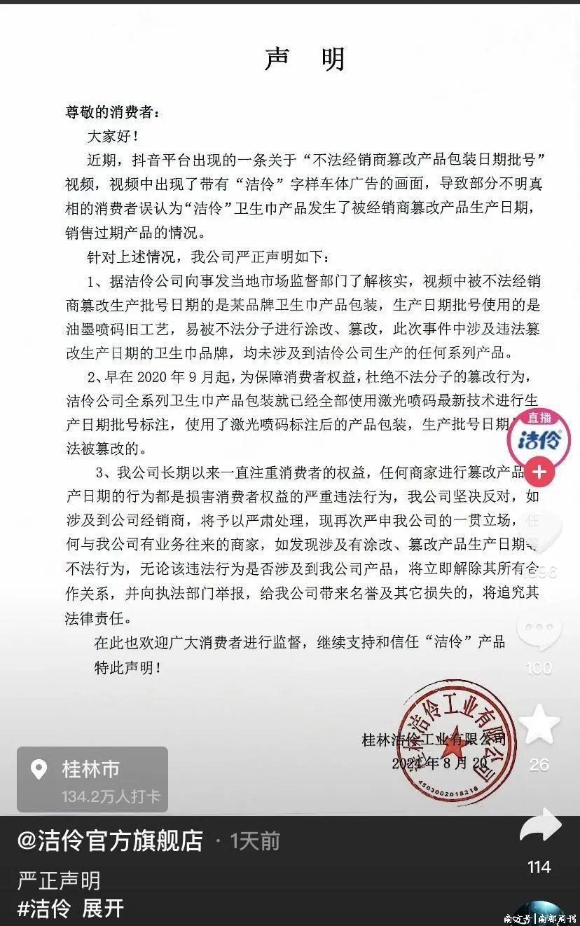 8月20日,洁伶官方旗舰店账号发布了一则声明。声明称,据洁伶公司向事发当地市场监督部门了解核实,视频中被不法经销商篡改生产批号日期的是某品牌卫生巾产品包装,生产日期批号使用的是油墨喷码旧工艺,易被不法分子进行涂改、篡改,此次事件中涉及违法改生产日期的卫生巾品牌,均未涉及到洁伶公司生产的任何系列产品。